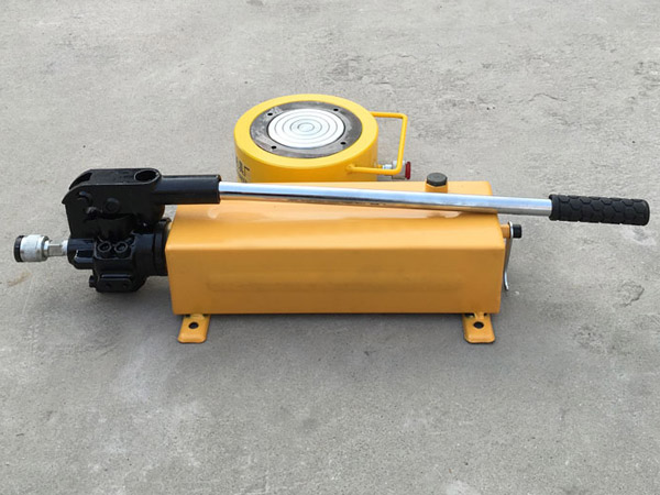 8、使用時先將手動泵的快速接頭與頂對接,然后選好位置,將油泵上的放油螺釘旋緊,即可工作。欲使活塞桿下降,將手動油泵手輪按逆時針方向微微旋松,油缸卸荷,活塞桿即逐漸下降。否則下降速度過快將產(chǎn)生危險。