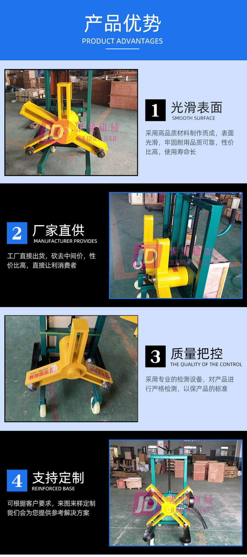 本機系參照裝卸叉車而設計的,底部為四個鋼質(zhì)萬向輪,經(jīng)久耐用。